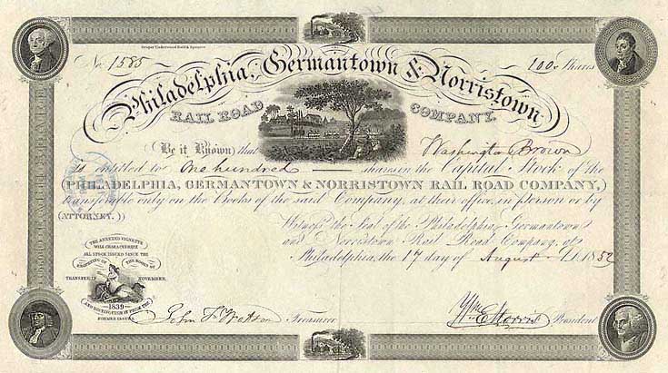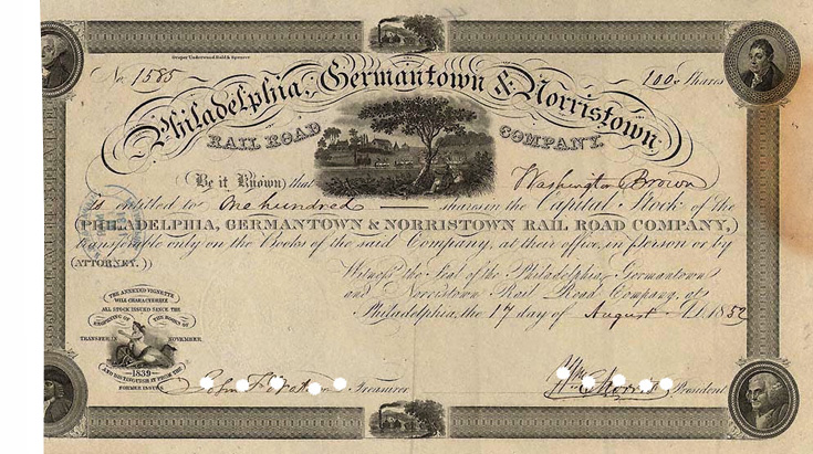 The above original 1852 stock certificate for the Philadelphia, Germantown & Norristown Railroad in Pennsylvania is stained on the right edge, has punch cancels through both signatures, and is missing a portion of its left border and the portraits of George Washington (top left) and Benjamin Franklin (lower left). First we digitally removed the stain and reconstructed the punch cancelled signatures. We then restored the missing portions of the border and portraits on the left by reconstruction and compositing using elements from both the border on the right and from the other portraits on the stock certificate.